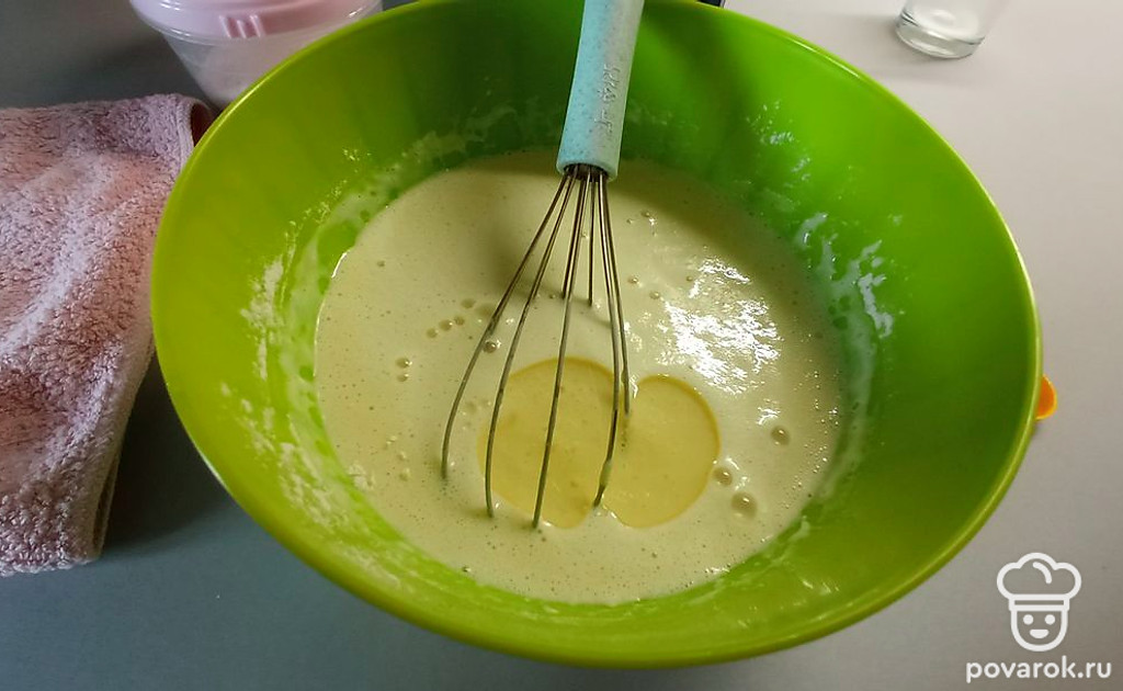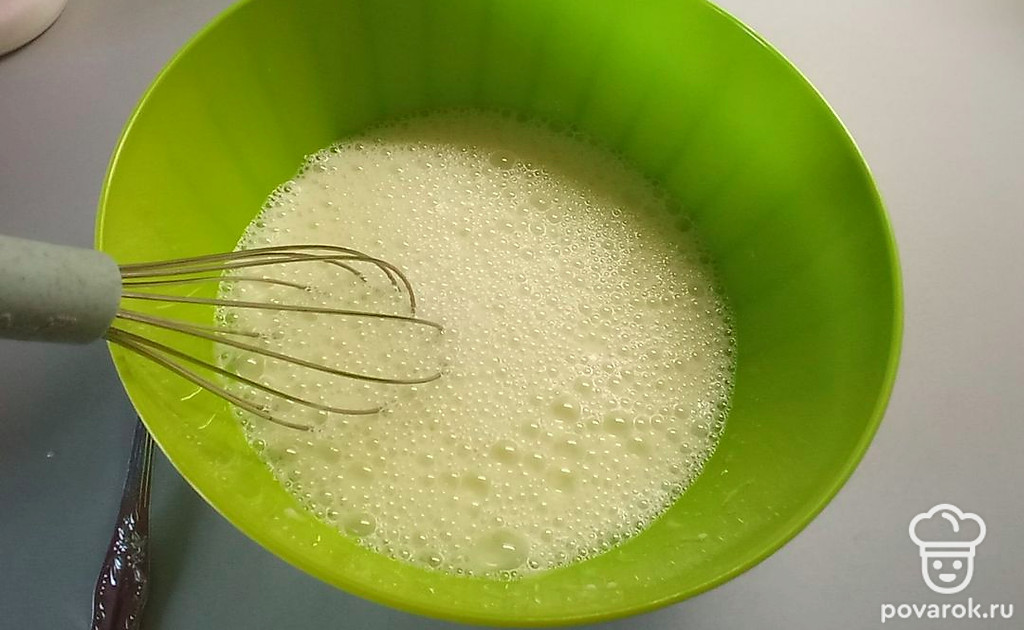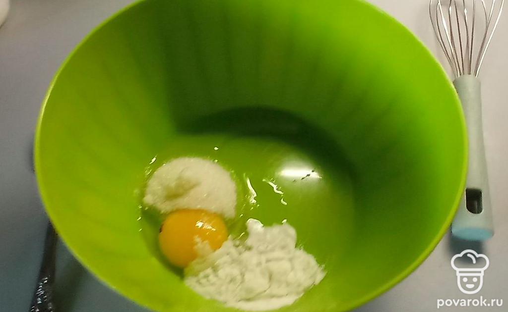 В миске смешайте яйцо, сахар, соль и разрыхлитель.
