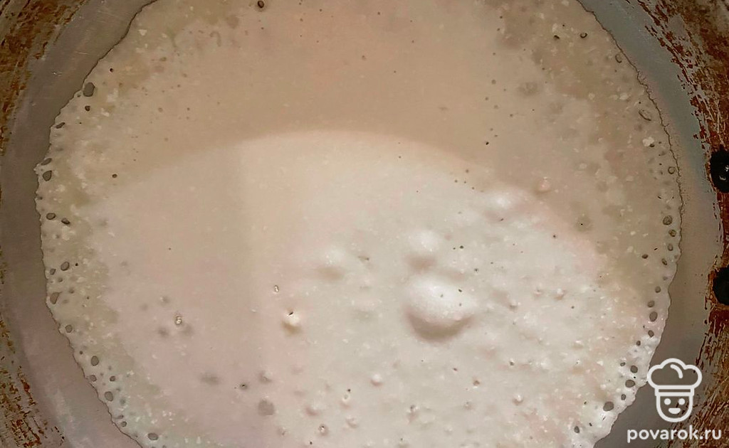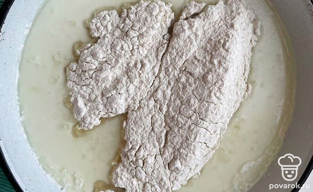 В смесь всыпьте муку и с помощью венчика или миксера замесите жидкое тесто без комочков.