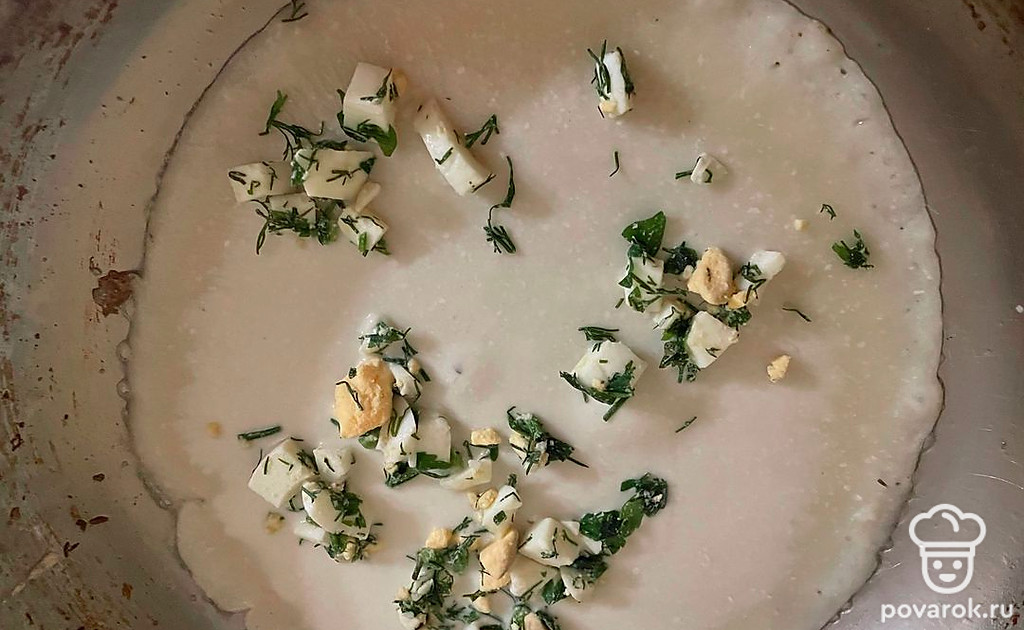 Измельчите оба ингредиента, чуть посолите и посыпьте смесью одну сторону блинчика. Затем переверните и выпекайте со стороны припека.