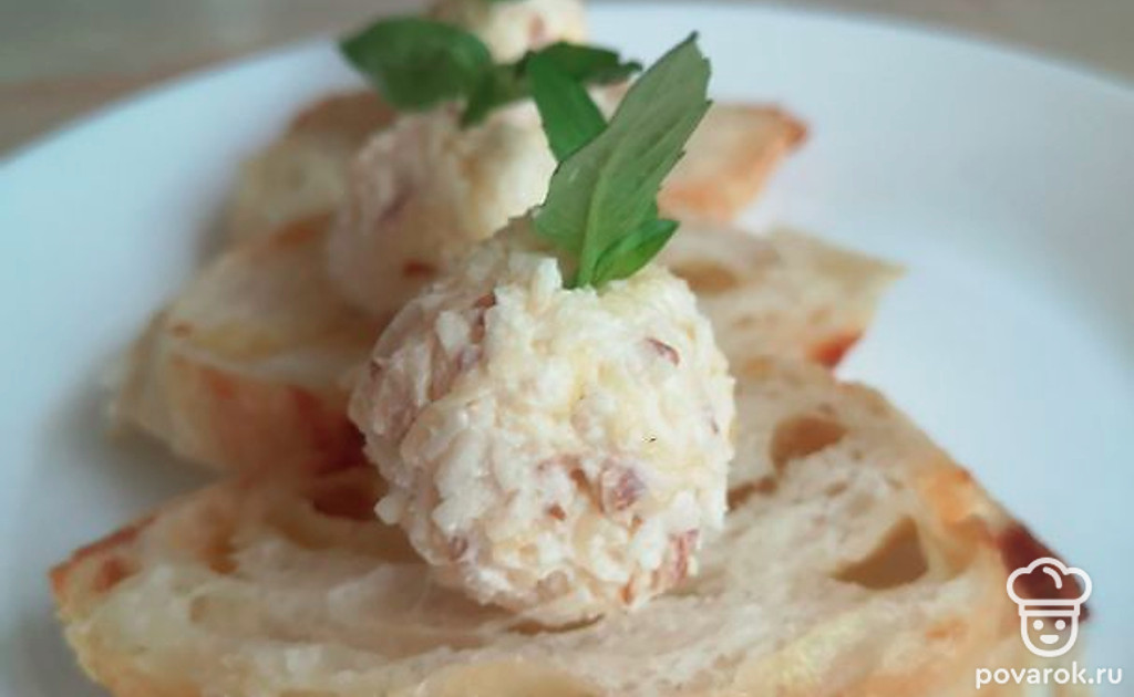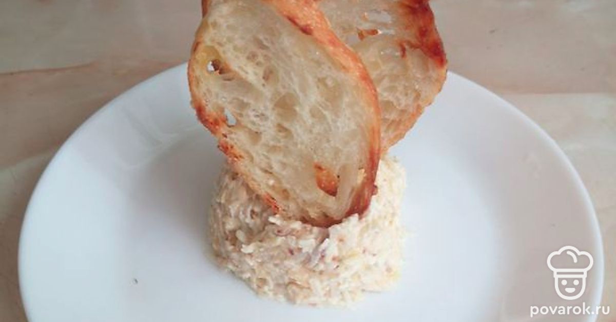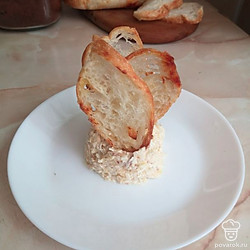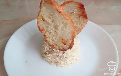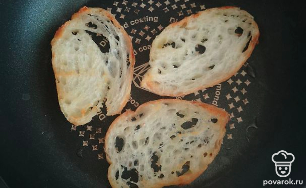 Багет нарезать тонкими ломтиками и обжарить на сухой сковороде.