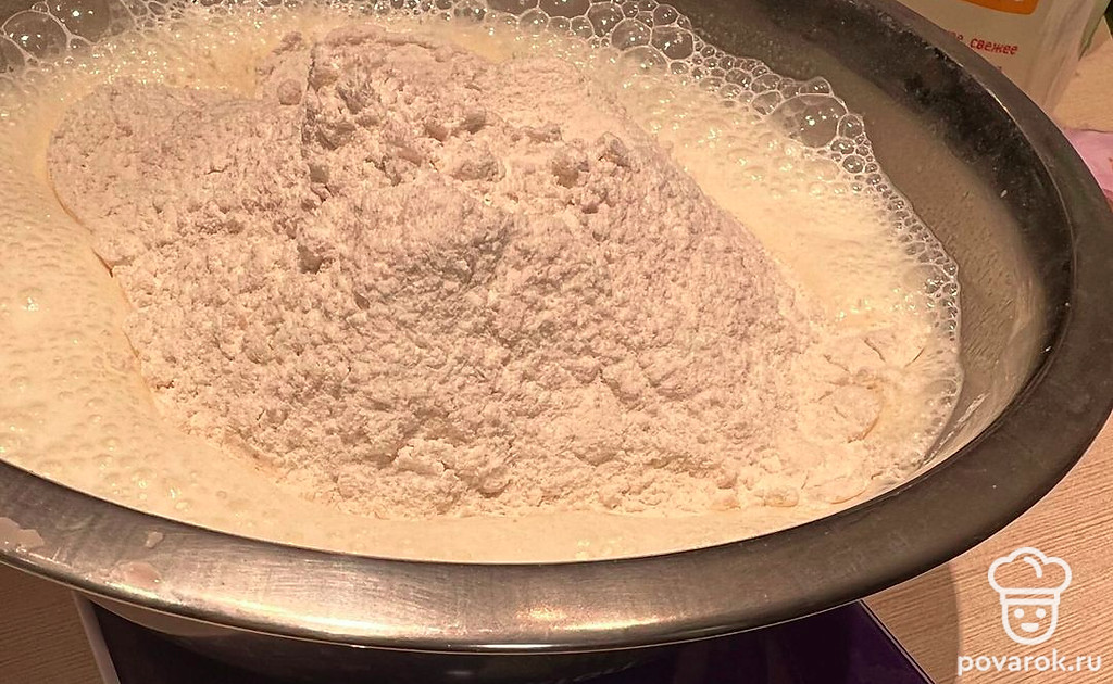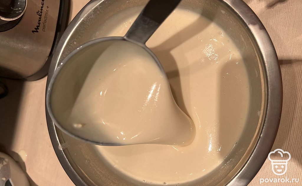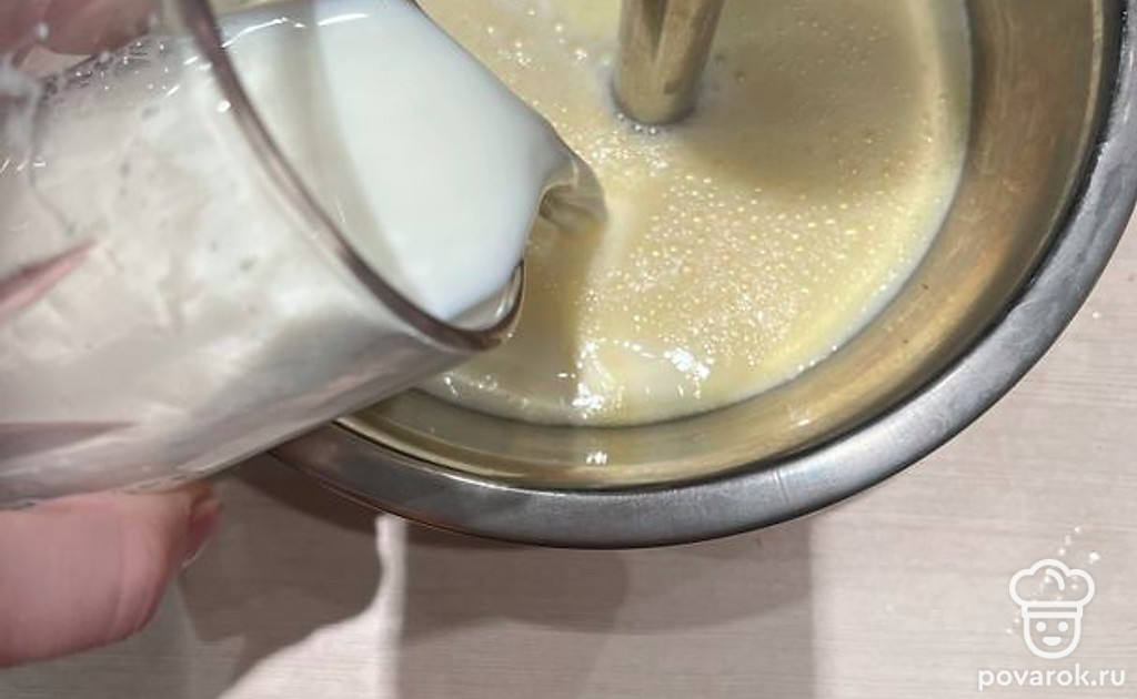 Добавить 200 г муки и 1 чайную ложку соды, снова все перемешать блендером.
