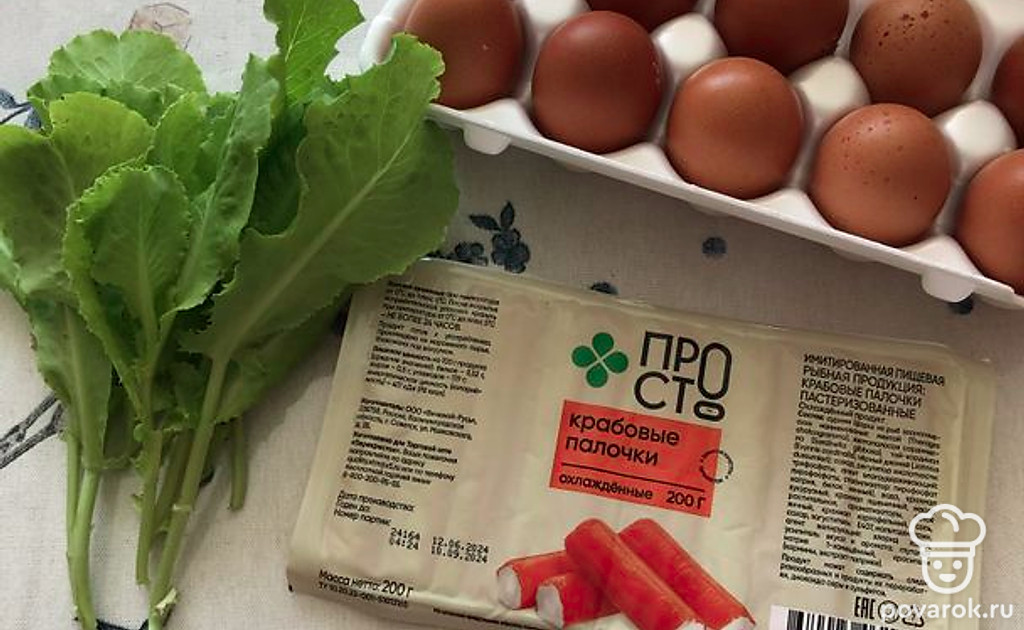 Основные ингредиенты это яйца и крабовые палочки. Зелень можно добавить любую. Я взяла пару листиков салата.