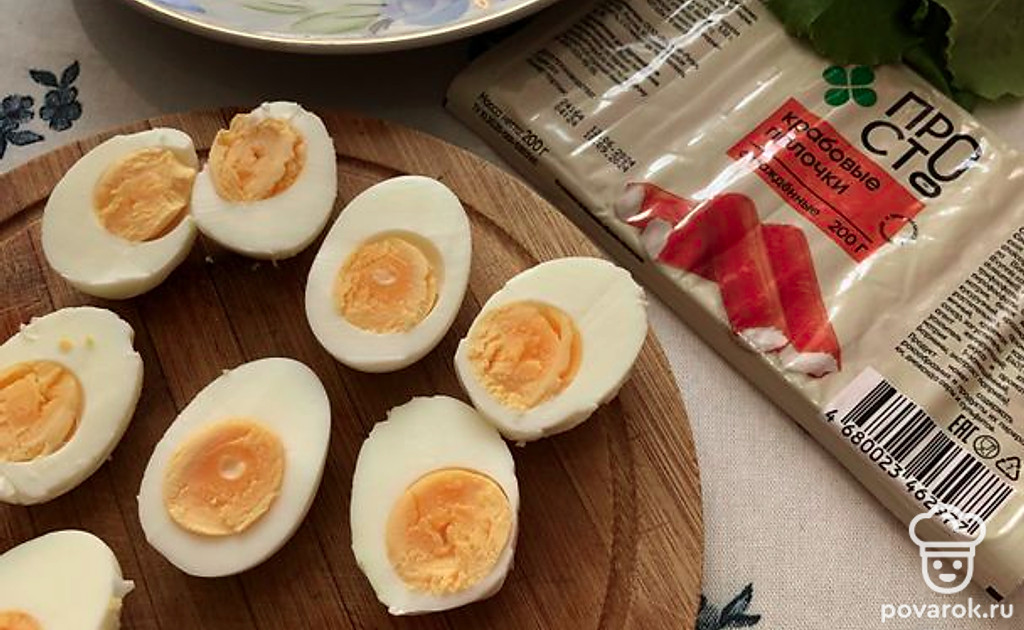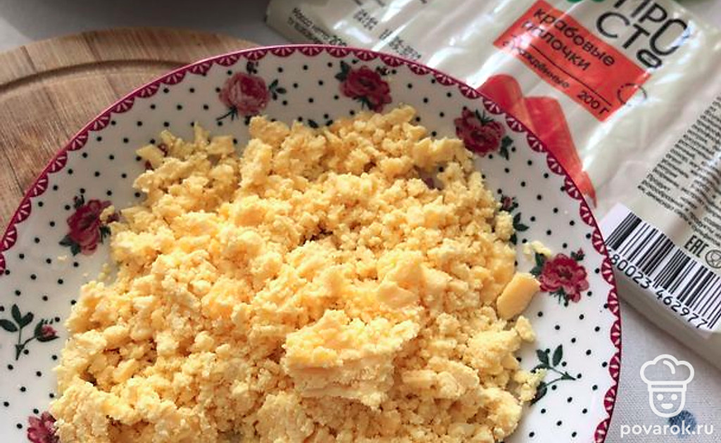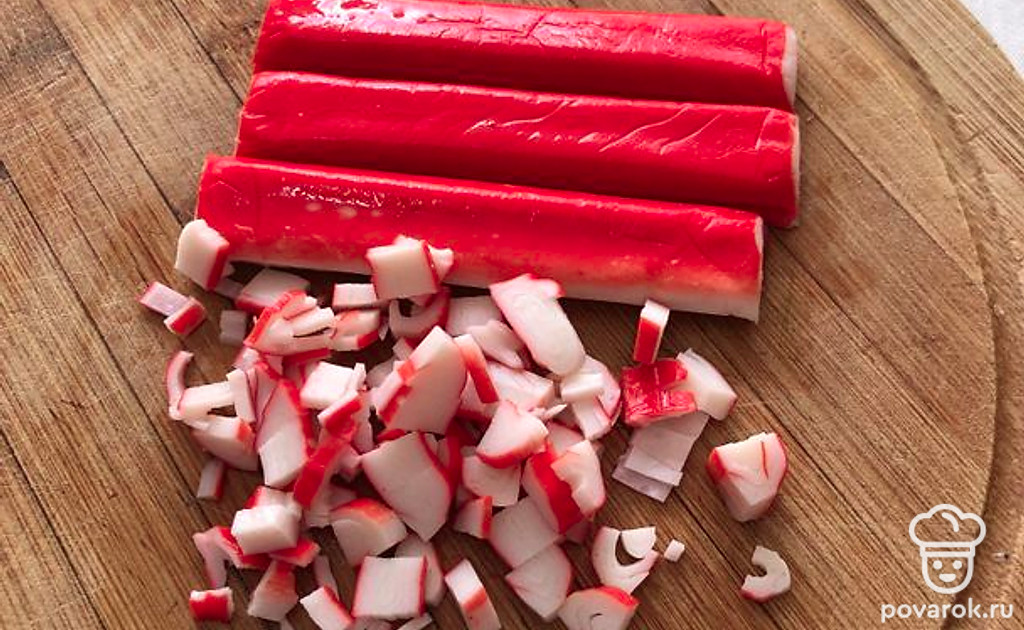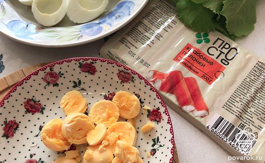 Мелко нарезаем крабовые палочки. По соотношению к желткам я беру 4 палочки.