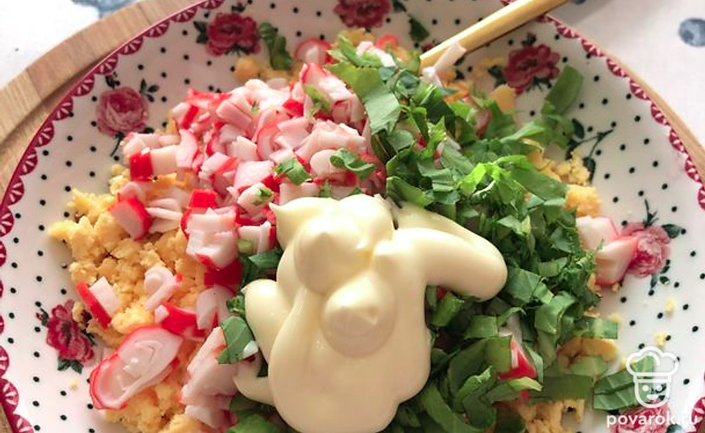 Добавляем их в тарелку с желтками и туда же нарезанную мелко зелень салата. Заправлем майонезом.