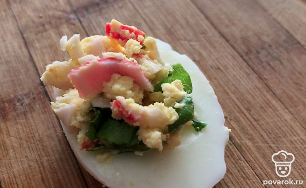 Каждую лодочку половинки яйца заправлем начинкой с горкой.