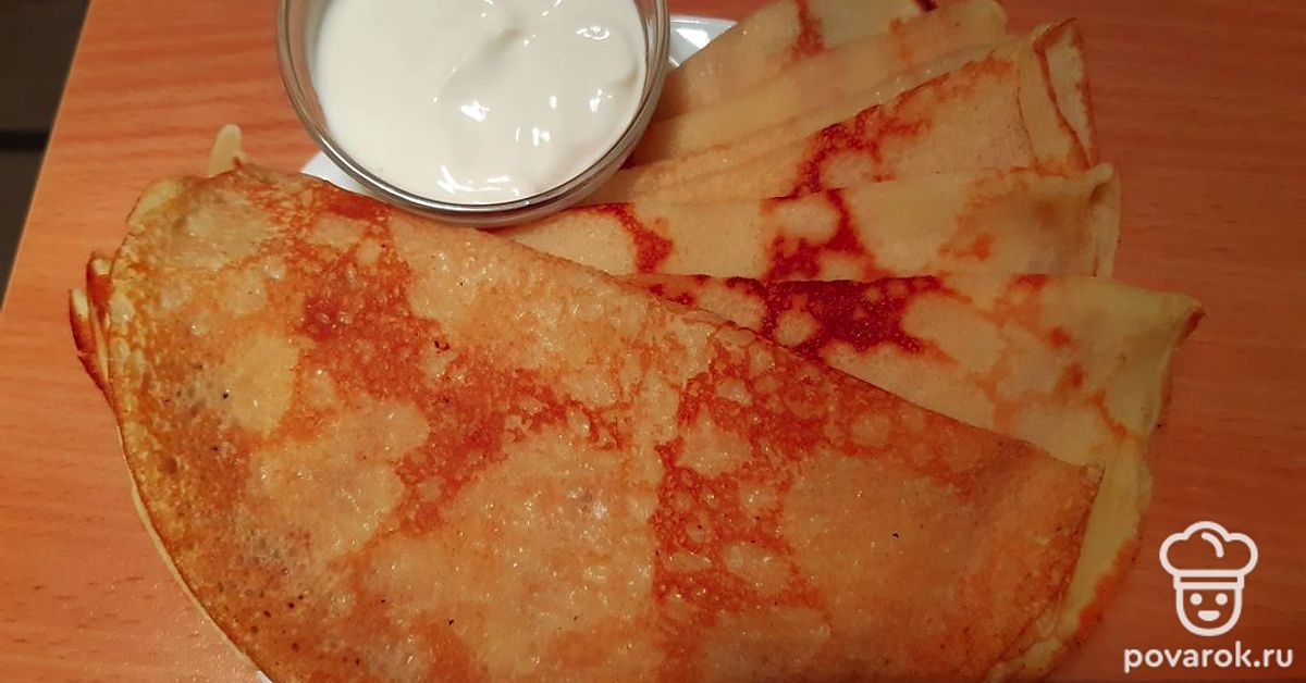Подать блины можно со сметаной, сгущёнкой или вареньем.