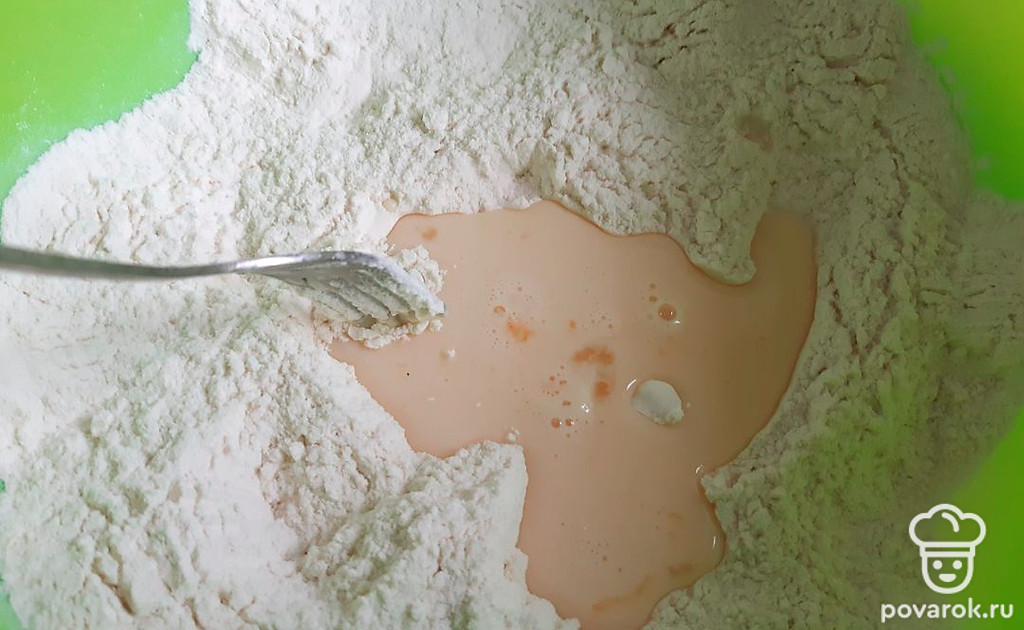 В просеянную муку влить яично-молочную массу, добавить кипяток, замесить тесто.