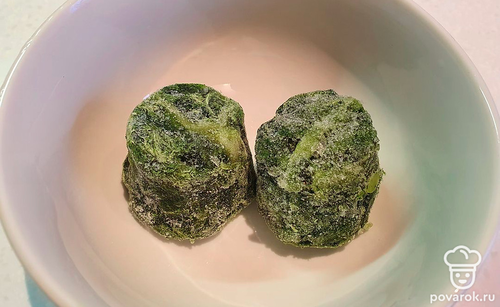 Замороженный шпинат подержать в горячей воде, затем измельчить блендером и добавить в тесто. Можно добавить чайную ложку растительного масла.