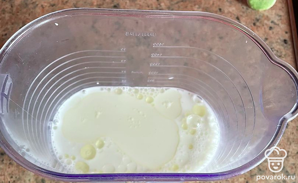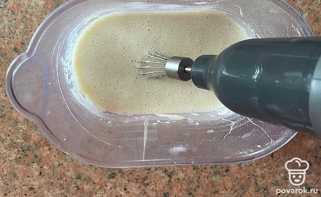 Всыпаем муку, соль, сахар, растительное масло. Все тщательно взбиваем. Тесто должно получится достаточно жидким.