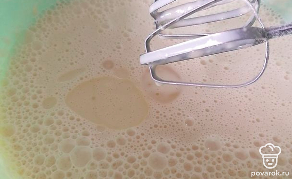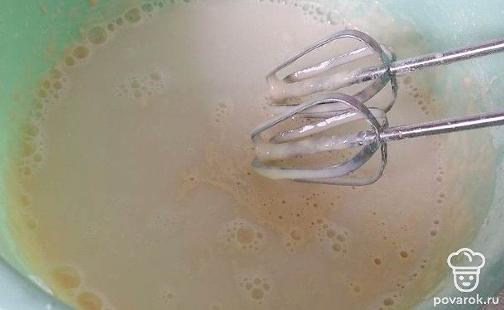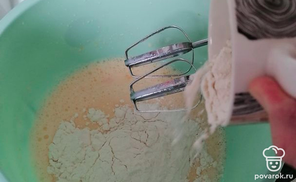 Постепенно всыпать всю муку и перемешать миксером. Должно получиться густое тесто.