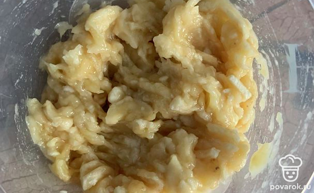 Банан размять мелко.