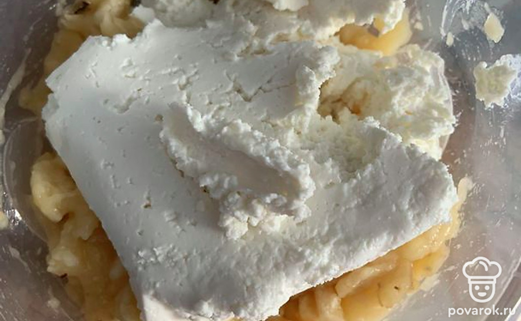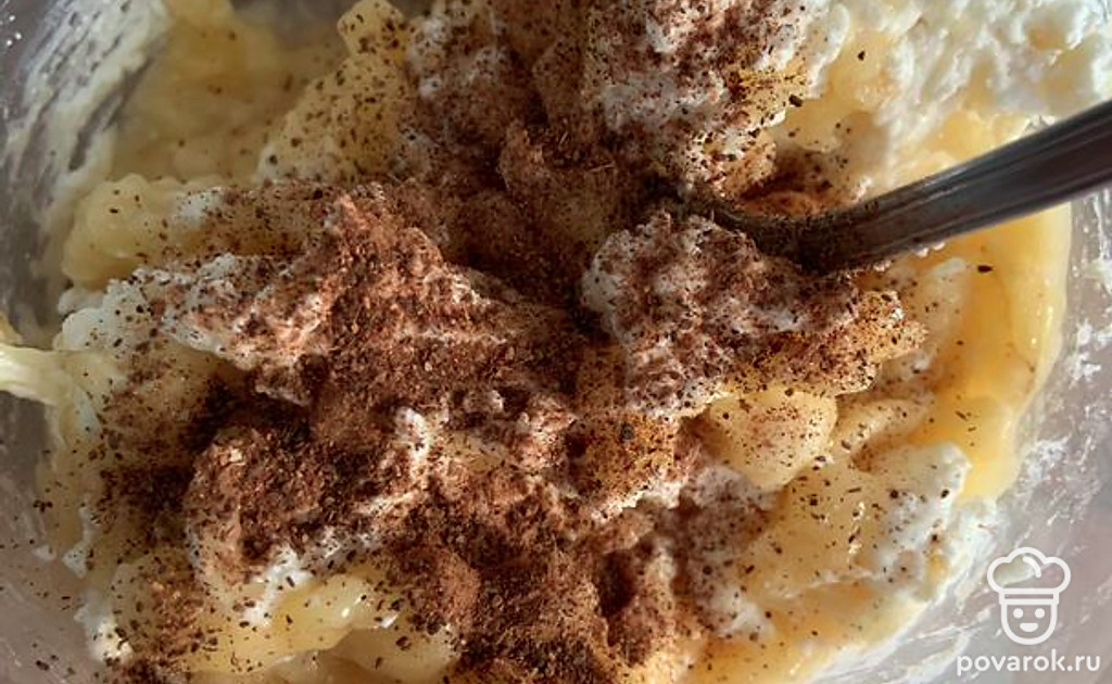 Добавить к банану творог и перемешать.