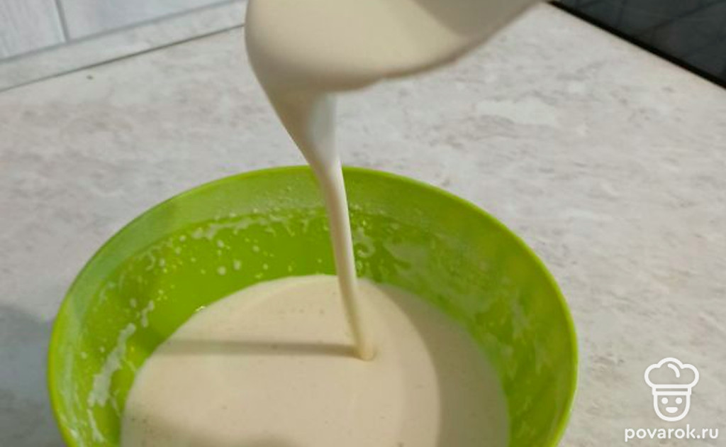 Добавляем муку. Хорошо перемешиваем, чтобы не оставалось камочков. И добавляем оставшееся молоко.