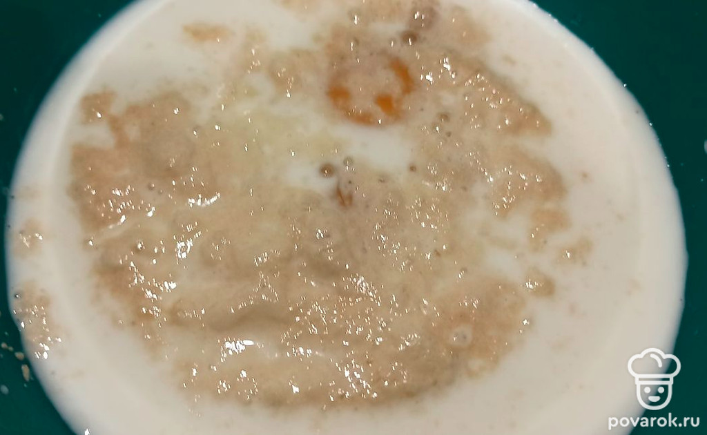 Для начала сделайте опару. Слегка теплое молоко перемешайте с сахаром и всыпьте дрожжи. Оставьте на полчаса.