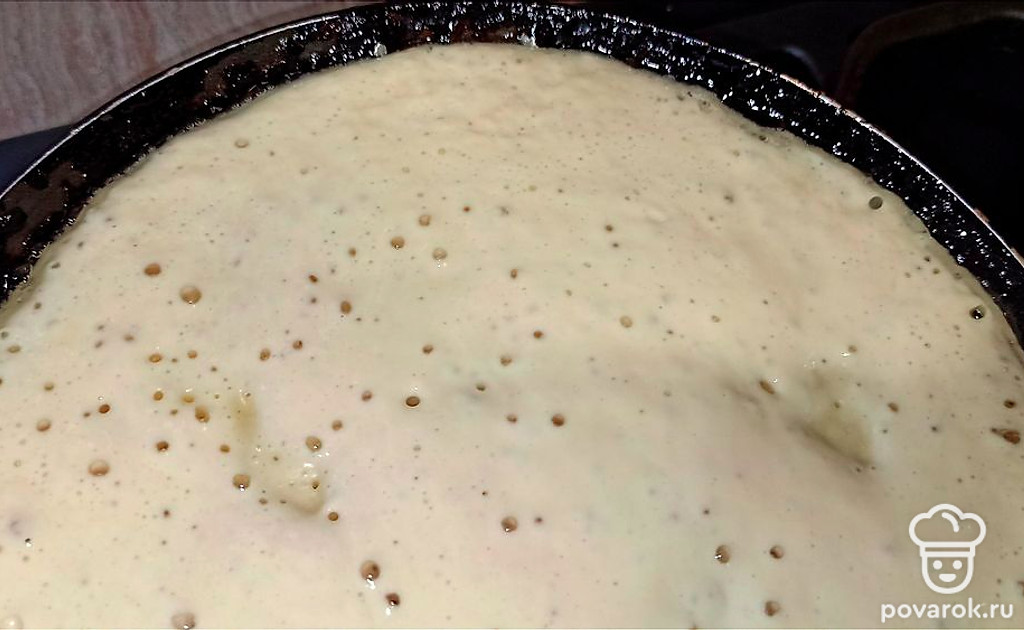 Сковороду смажьте маслом и вылейте тесто. Переворачивайте каждые 2 минуты.