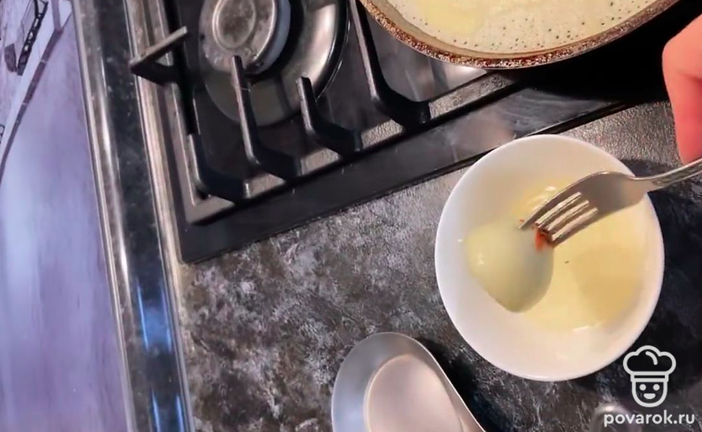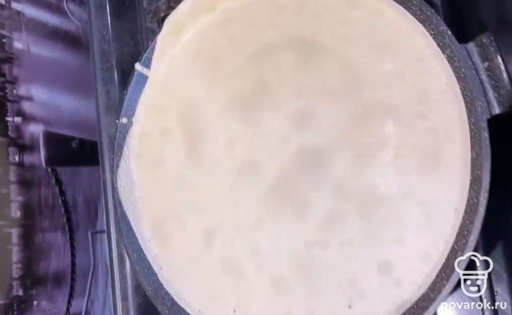Сковородку смазываем маслом перед каждым блинчиком. Чтобы было экономно делаем это половинкой лука.