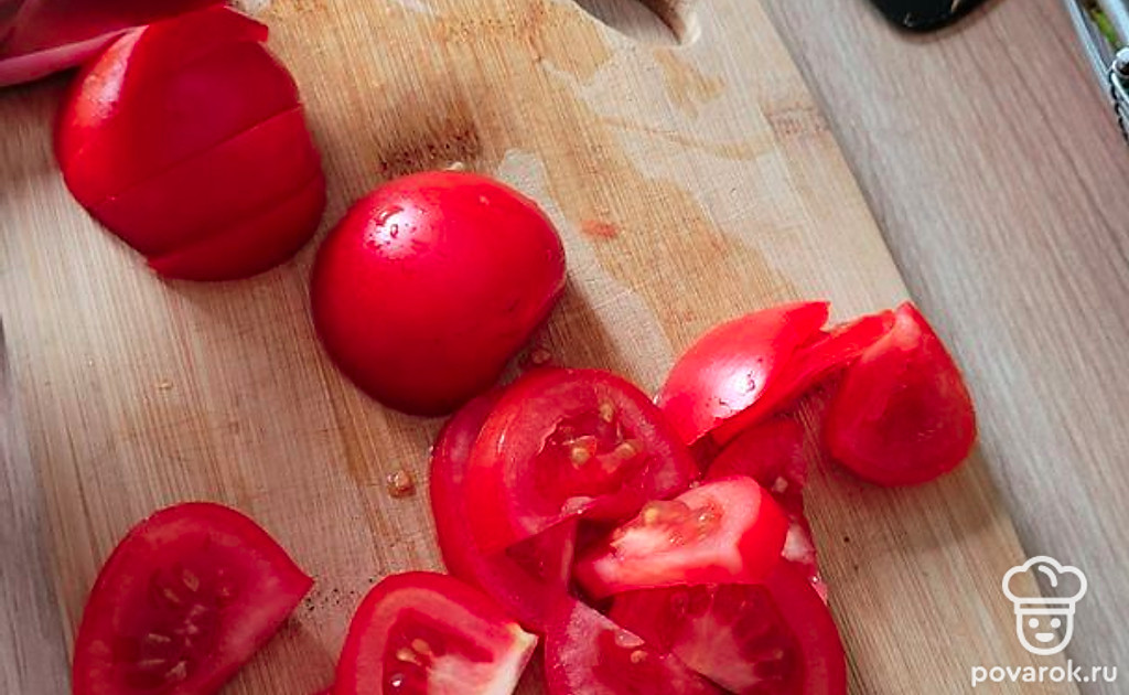 Пока блин жарится, помыть помидор и нарезать на дольки, обмыть листья салата.