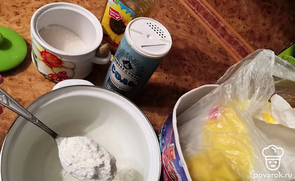 Соберите все сухие ингредиенты: 5 столовых ложек муки с небольшой горкой, потом будете добавлять ещё на глаз +1 щепотка соли + 2 чайные ложки с горкой сахара + 1 столовая ложка подсолнечного масла.