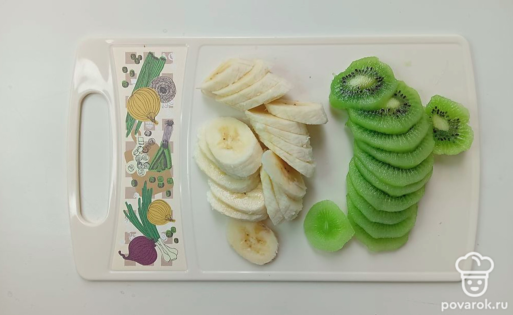 Очистите киви и банан. Нарежьте тонкими колечками.