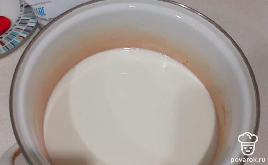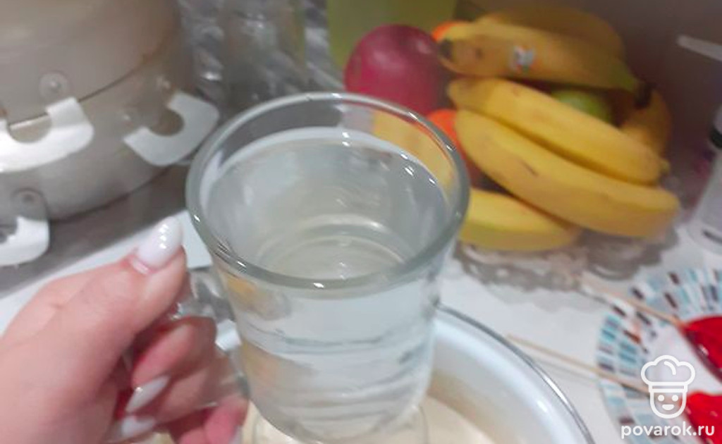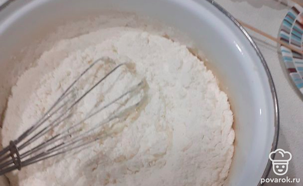 К пустому тесту добавляем кипяток и хорошенько перемешиваем. Должно получиться жидкое тесто.