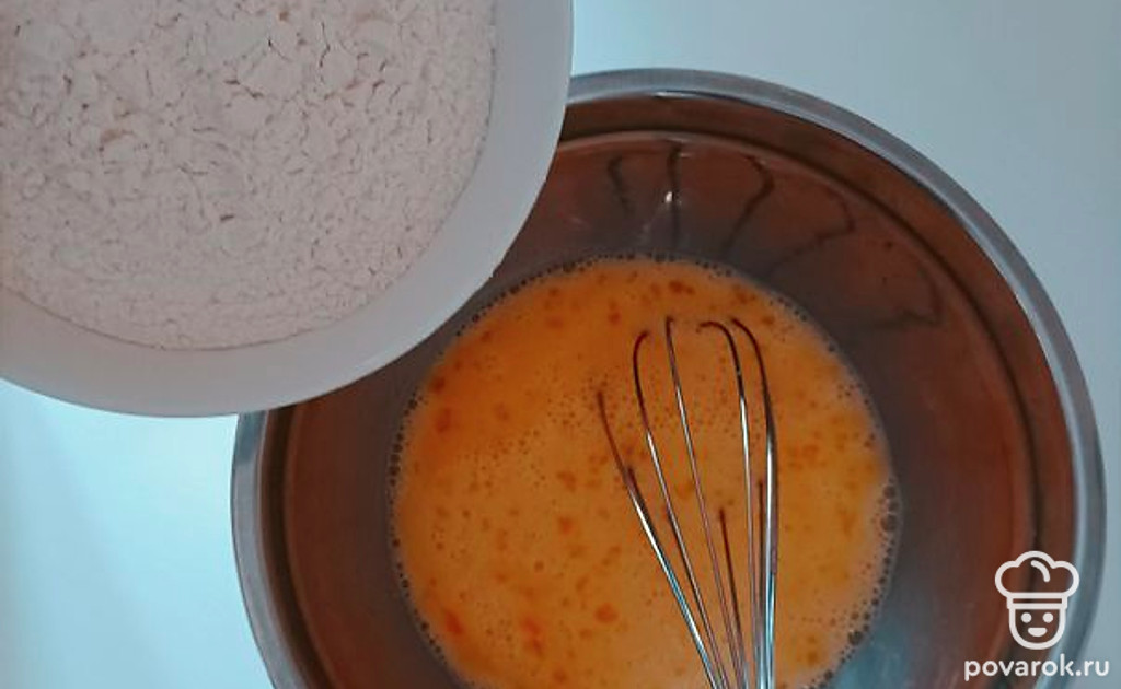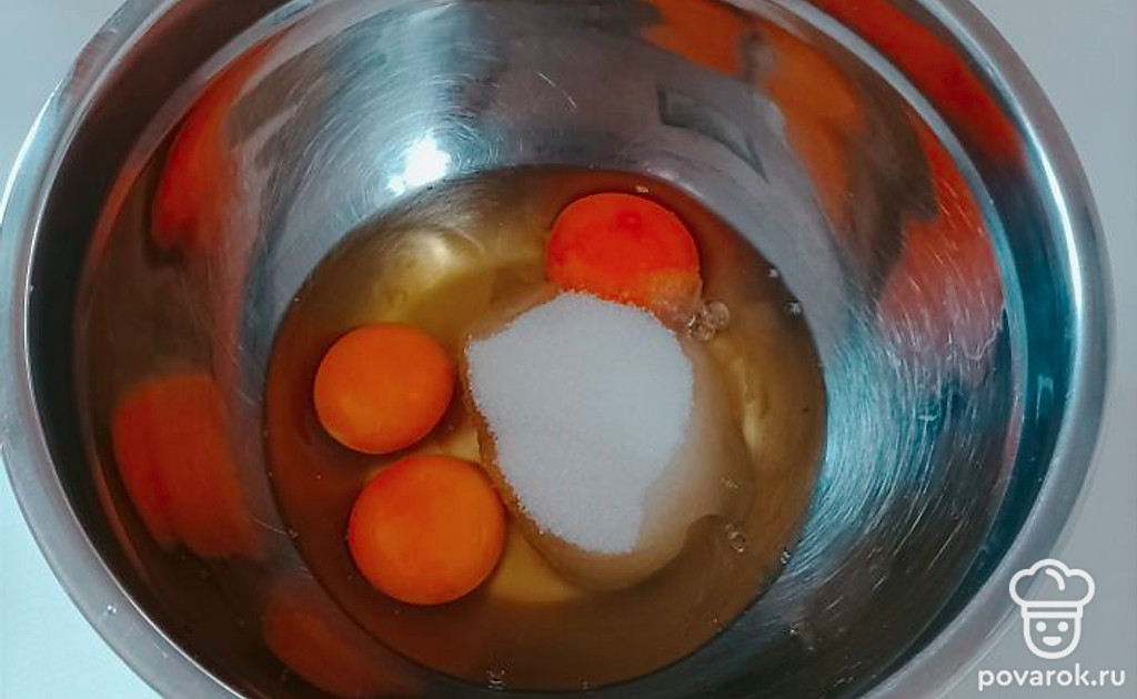 Разбиваем яйца в миску, добавляем сахар и соль. Хорошо взбиваем венчиком.