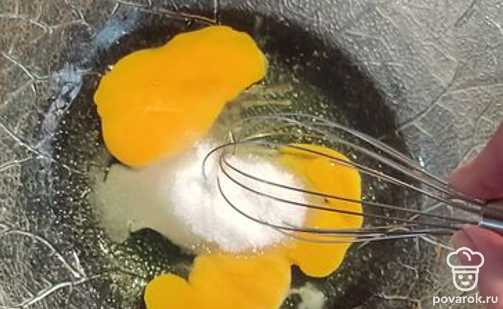 В подходящую миску разбиваем 2 яйца и добавляем 2 ст.л. сахара, перемешиваем венчиком (можно вилкой).