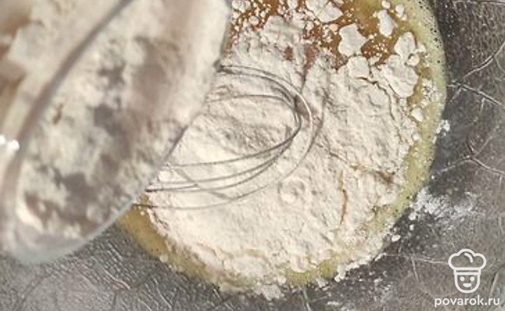 Добавляем пол стакана муки и перемешиваем до однородной массы, муку можно просеить через сито.