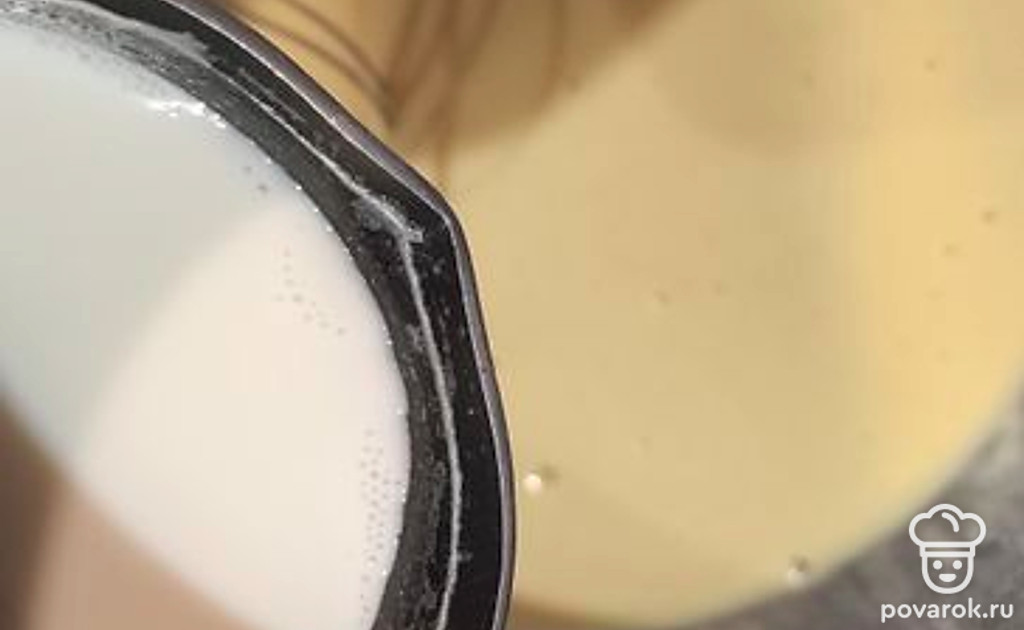 Добавляем частями теплое молоко и хорошо перемешиваем.