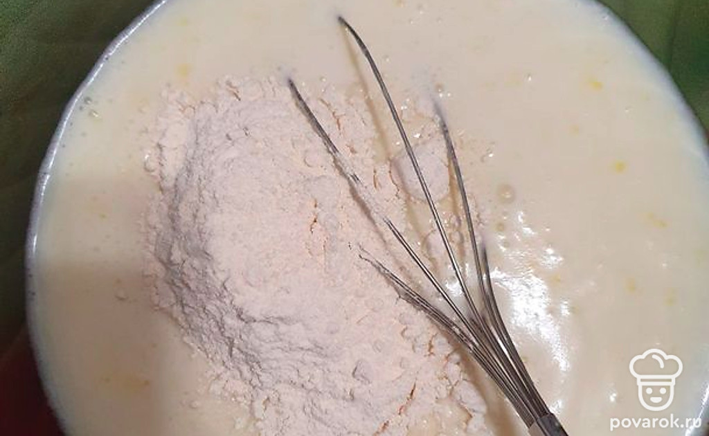Добавляем муку, взбиваем до однородного состояния.