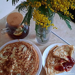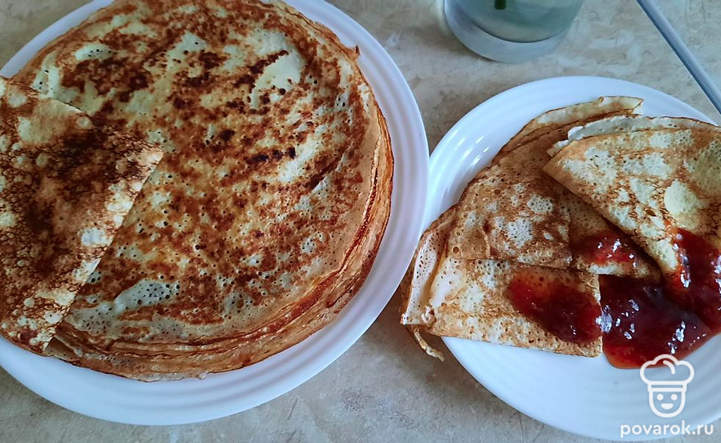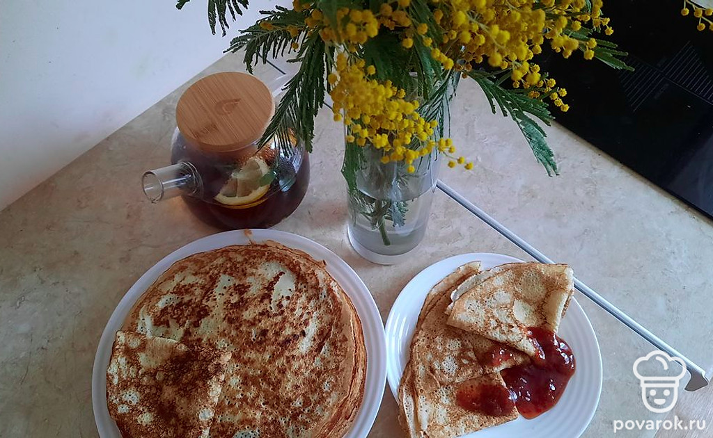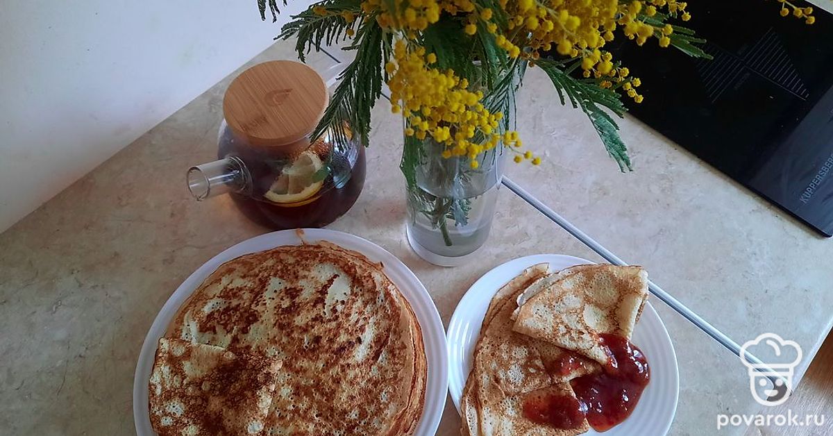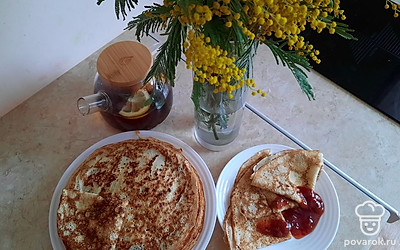 Это мой любимый рецепт. Блинчики всегда получаются тонкими и ажурными. Главный секрет этих блинчиков - это кипяток, очень горячая сковорода и постоянное смазывание ее маслом.