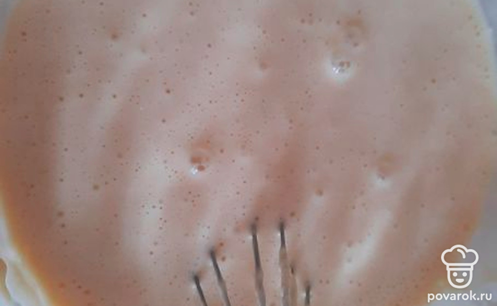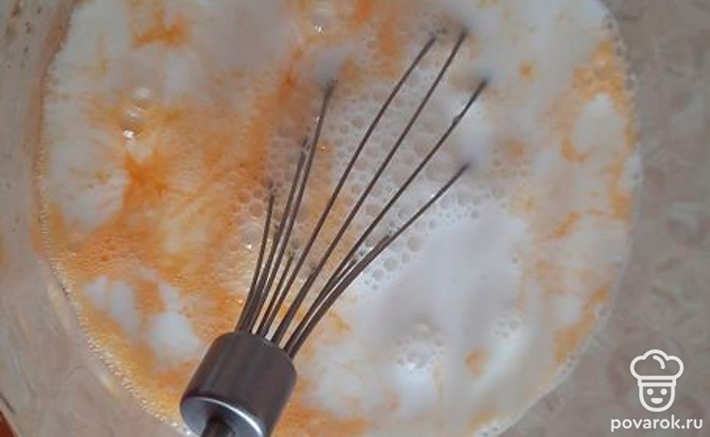 Вливаем молоко. Оно должно быть теплое либо комнатной температуры. Перемешиваем.