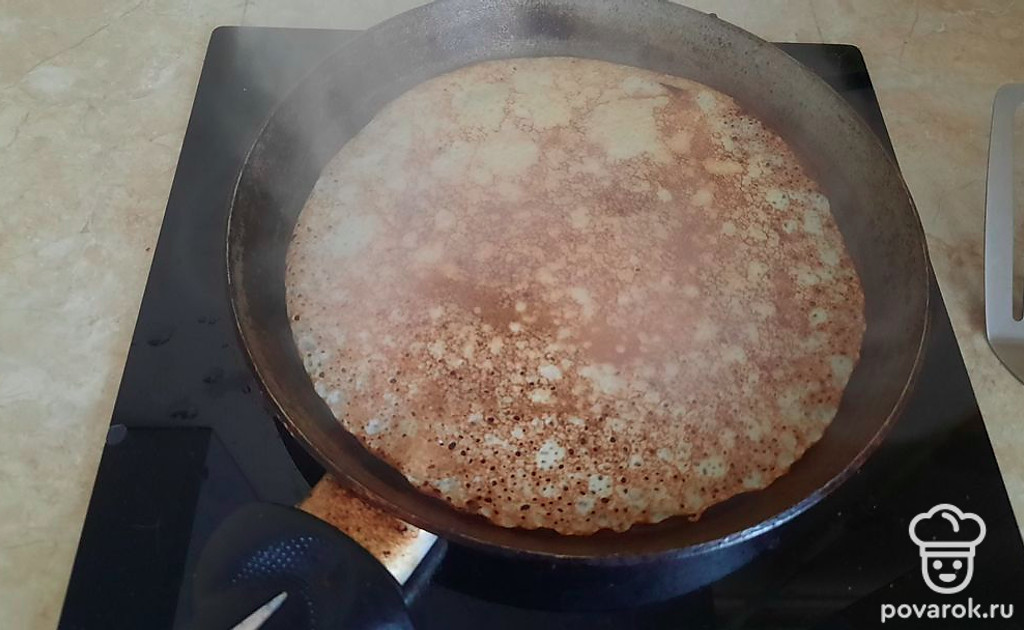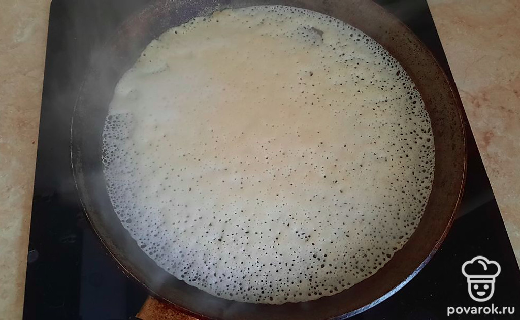 Начинаем жарить, предварительно сильно разогрев сковороду. От нее должен идти дымок. Смазываем сковороду сливочным маслом и выливаем половником тесто. Оно будет достаточно жидкое, легко распределится по сковороде и сразу начнут появляться дырочки. Это значит, что вы все сделали верно.