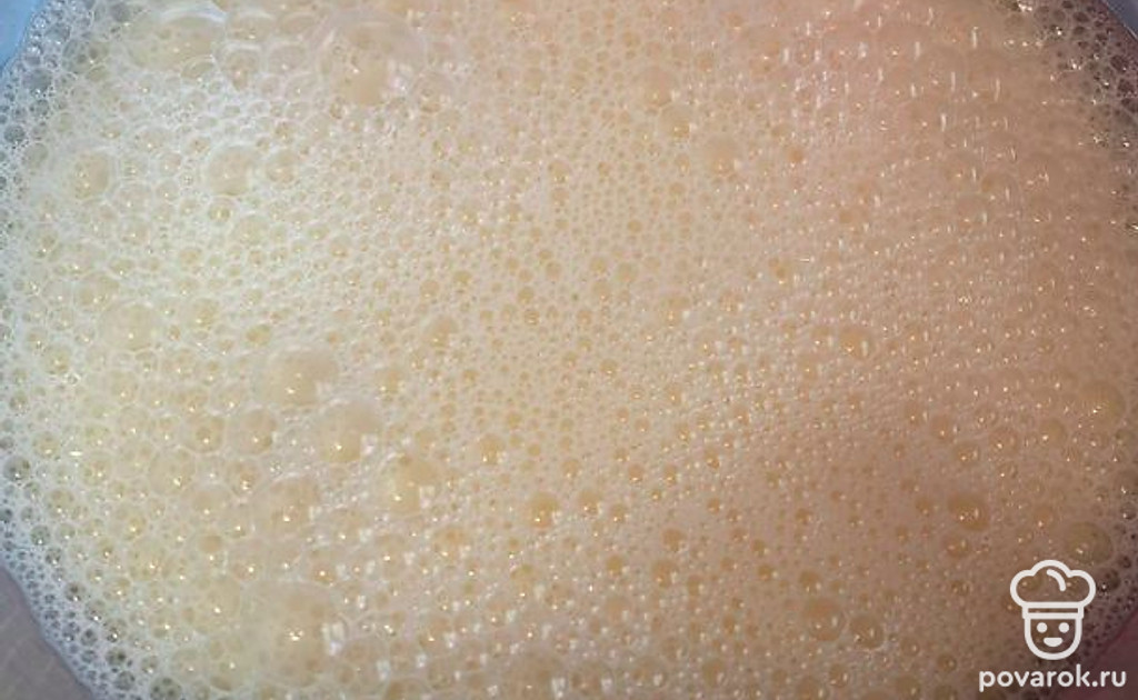 Добавляем оставшееся молоко, растительное масло, всё смешиваем и тесто готово. Оно должно получится, как жидкая 10% сметана.