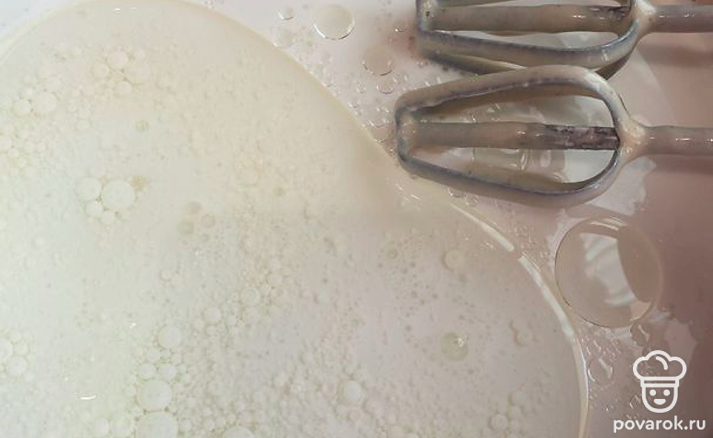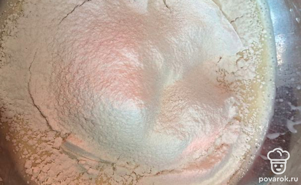 В получившуюся смесь просеиваем муку и перемешиваем миксером.