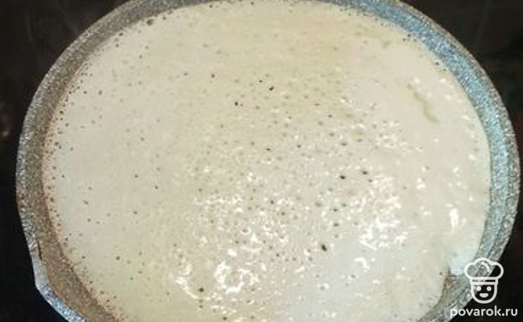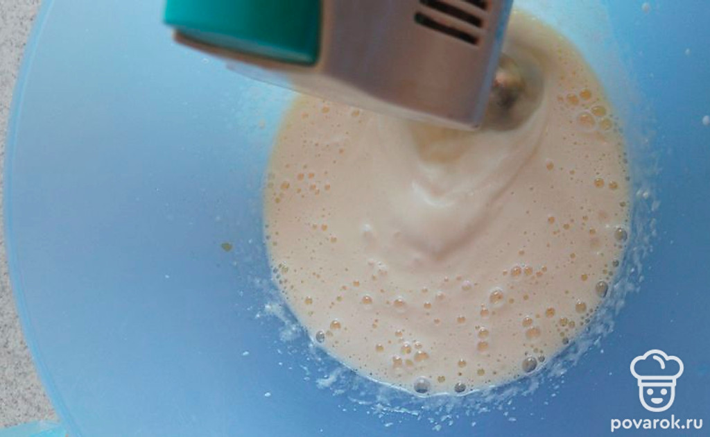 Вливаем кефир и тонкой струйкой кипяток, снова взбиваем.