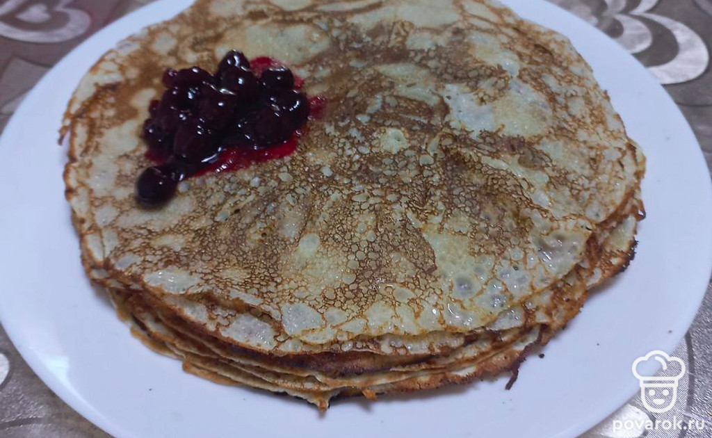 Блины можно подавать на стол вместе с вишневым или любым другим вареньем.