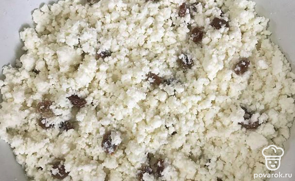 Пока печётся блин, соединяем промытый изюм с творогом, добавляем сахарный песок. Хорошо перемешиваем.