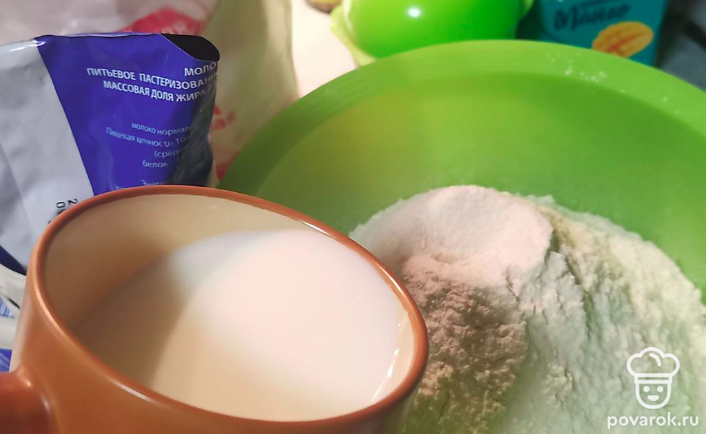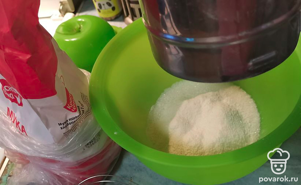 Берем 4 ложки сахара и щепотку соли, перемешиваем. Добавляем просеянную муку. Все хорошенько перемешиваем.