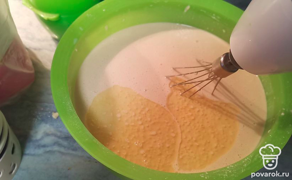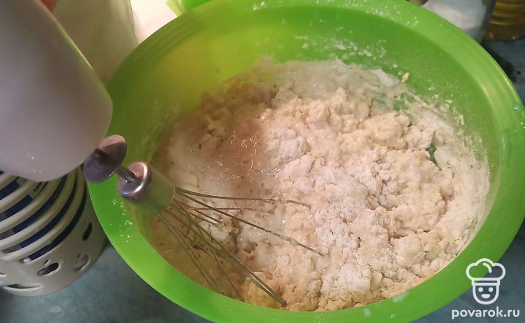 Основательно перемешиваем, чтобы не было комочков. В конце добавляем 3 ложки растительного масла, перемешиваем и отставляем смесь на время.
