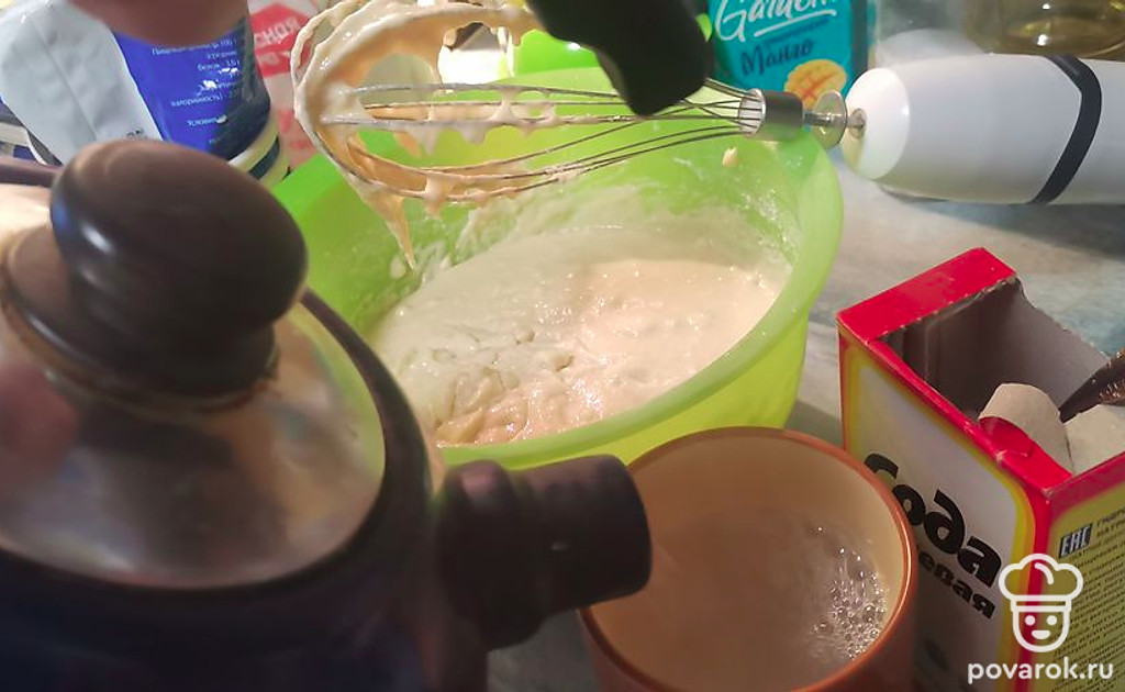 Как только чайник закипит, выливаем стакан воды и сразу добавляем его к основной смеси. При этом не останавливаясь перемешиваем. Я смешиваю миксером на самой низкой скорости.