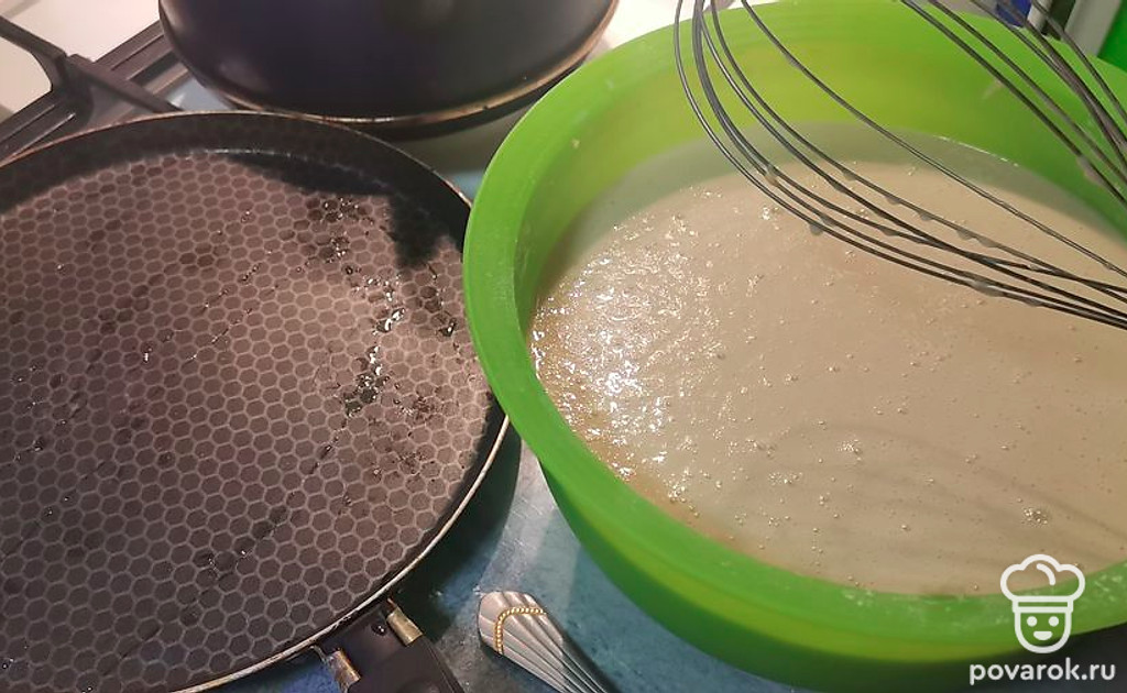 Ставим сковородку на огонь, ждем, пока нагреется, и выливаем смесь.
