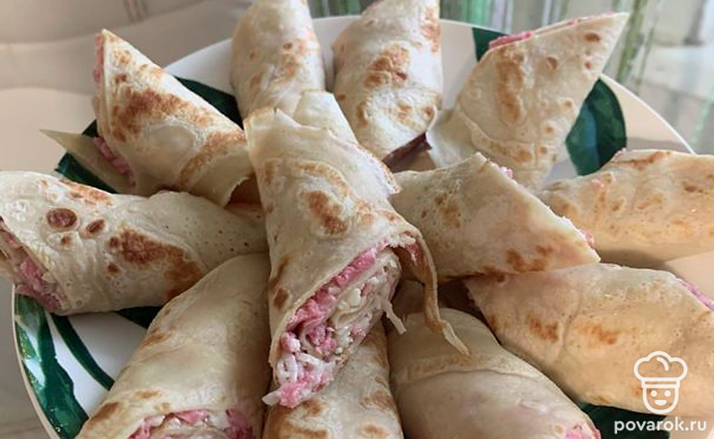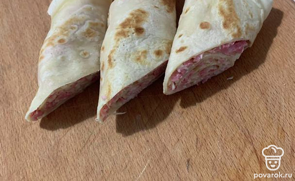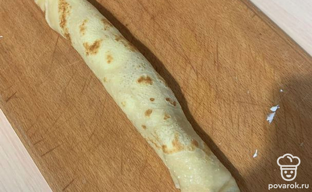 Блинчик заворачиваем в трубочку и режем так как будет удобно вам.