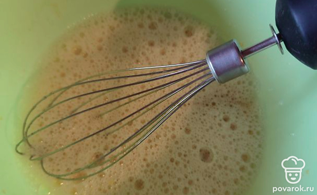 Взбейте яйца с сахаром и солью при помощи миксера или венчиком. Если готовите сладкие блинчики, по желанию можете добавить ванильный сахар.