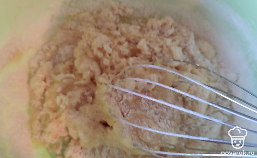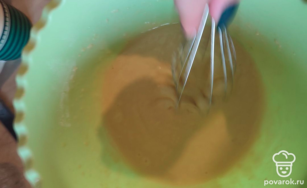 Влейте молоко и тщательно перемешайте, чтобы не осталось комочков. Добавьте воду и масло и снова перемешайте.
