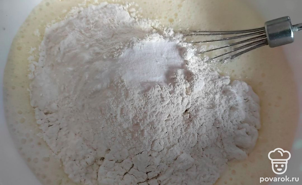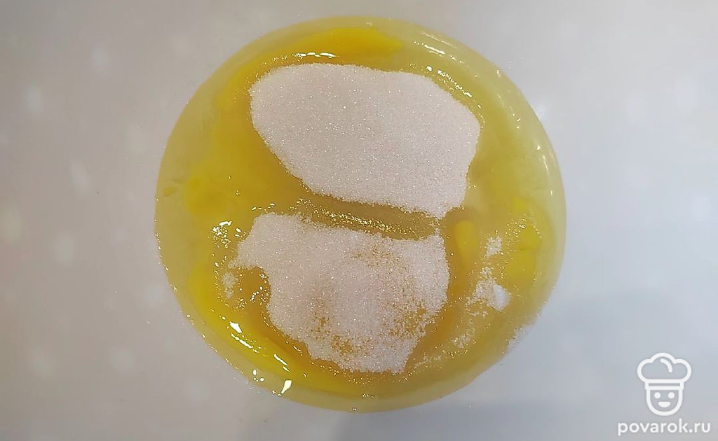 В глубокую миску разбиваем яйца и высыпаем к ним сахар, соль. Все тщательно взбиваем.