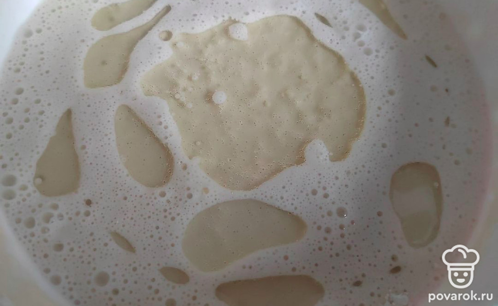 В тесто выливаем масло и даем настоятся 10 минут. После этого приступаем к жарке блинов.