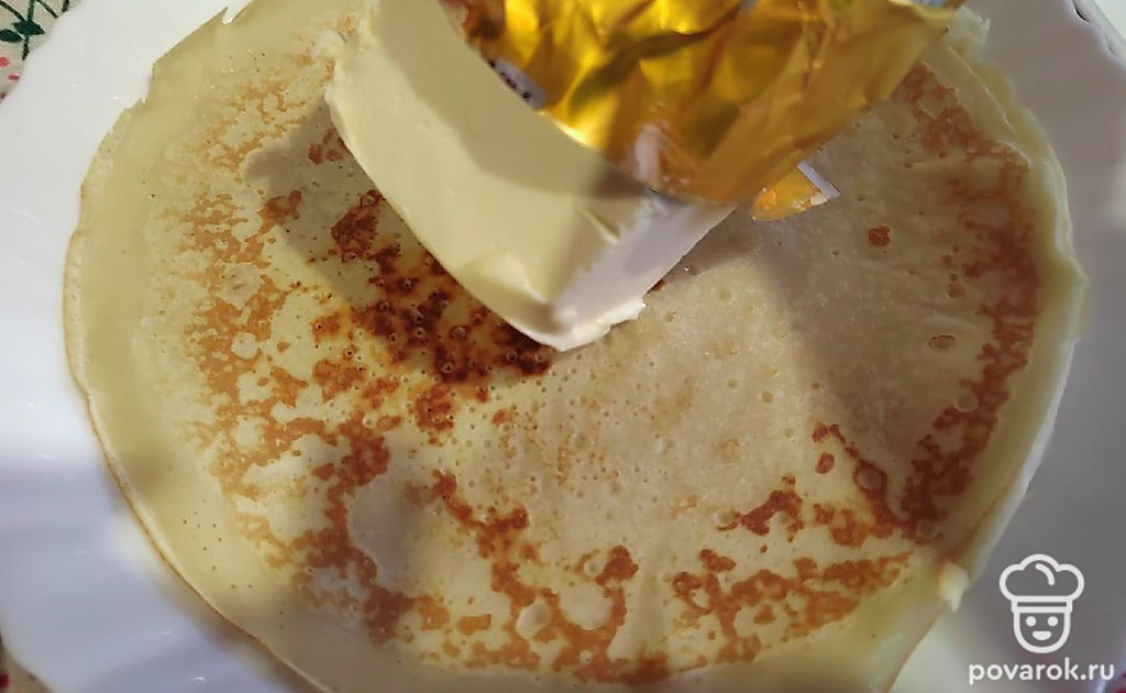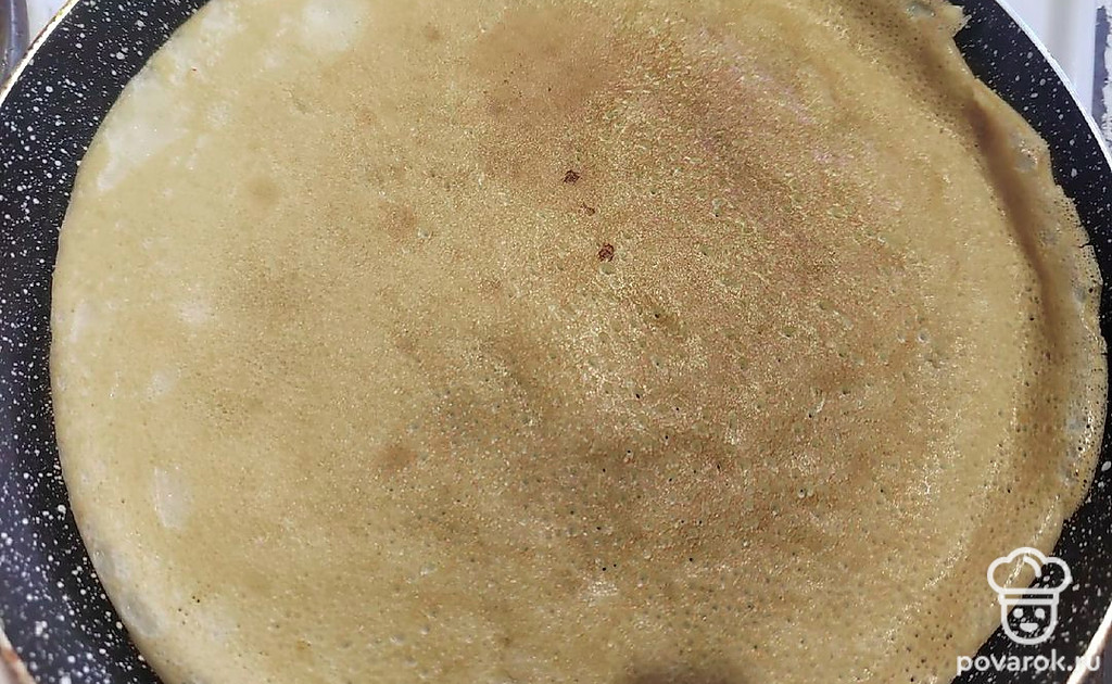 С помощью половника выливаем на сковороду тесло и круговыми движениями распределяем тесто по всей плоскости сковороды. Обжариваем по 1-2 минуты с двух сторон.