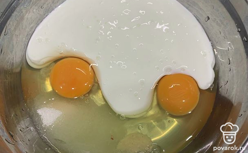 В миску разбить яйца, добавить сахар, соль, кефир. Перемешать венчиком.