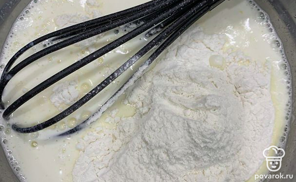 Добавить просеянную муку и растительное масло. Перемешать, чтобы не было комочков. Дать постоять двадцать минут и выпекать.