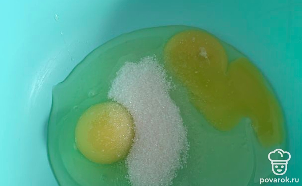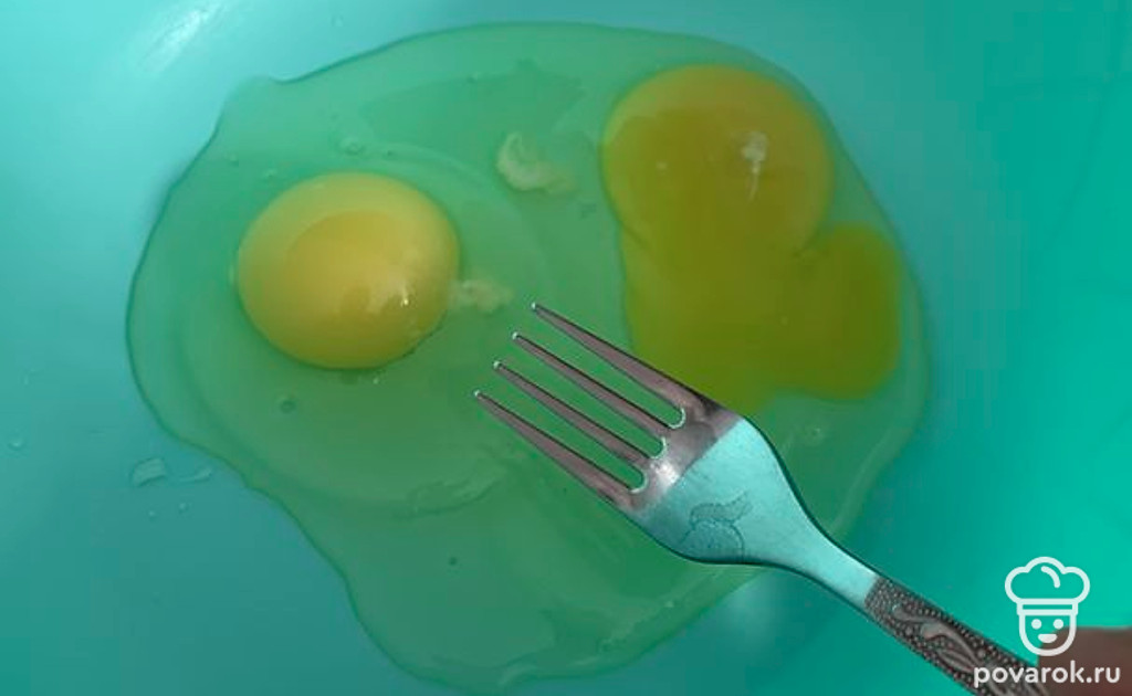 Добавить соль, сахар к яйцам и хорошо перемешать вилкой.